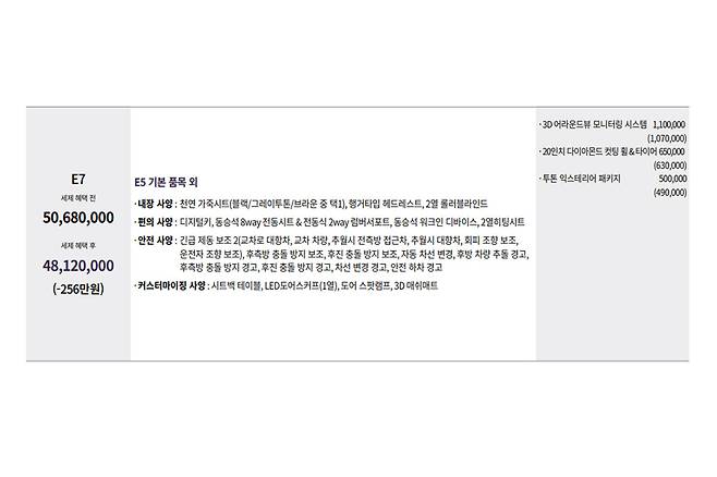 상위 등급인 E7은 상술한 E5의 기본 사양 외에 천연 가죽 시트와 행거타입 헤드레스트, 2열 롤 블라인드가 기본으로 적용된다. 아울러 디지털키, 조수석 워크인 디바이스와 2열 열선 시트 등 동승객을 위한 옵션이 두드러진다. 교차로와 전측방을 대항하고 회피 조향을 보조해 주는 긴급 제동 보조 2 옵션이 기본으로 적용되는 것도 차이점이다.