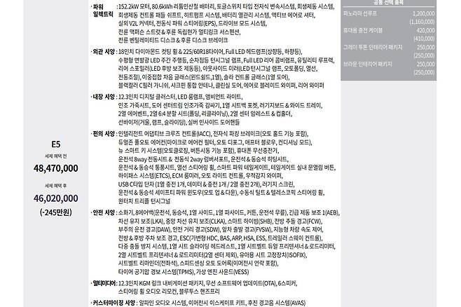 그렇다면 기본 등급인 E5에 선택할 수 있는 옵션은 무엇이 있는지 알아보자. E5 등급에서 적용할 수 있는 선택사양은 총 4가지로, 파노라마 선루프와 휴대용 충전 케이블 (전기차), 그레이 투톤 / 브라운 인테리어 패키지다. 첨단 사양은 이미 기본 적용되어 있으니, 약간의 화려함이나 개방감 정도를 더해주는 구성으로 이뤄져 있다. 선루프는 호불호가 갈리는 옵션이긴 하지만, 개방감이 좋아 추가하는 편이 더 나을 것으로 보인다.