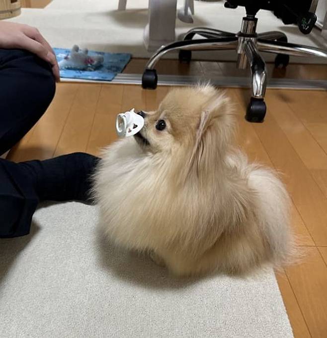 포메라니안 강아지는 아무렇지 않다는 듯이 입에 쪽쪽이를 물더니 아빠 집사를 사랑스러운 눈빛으로 바라본 것.