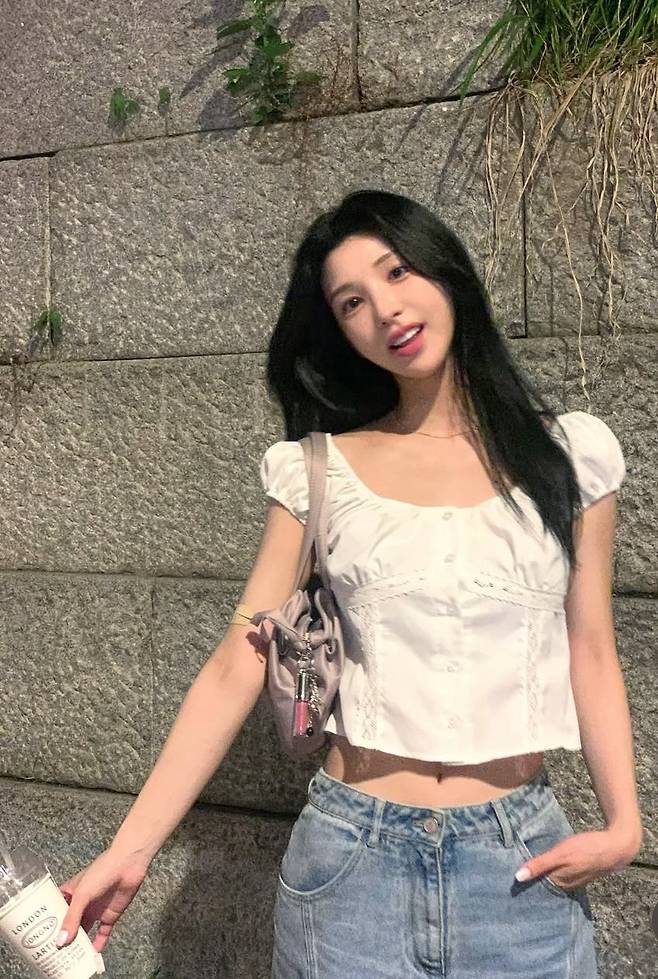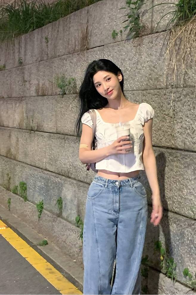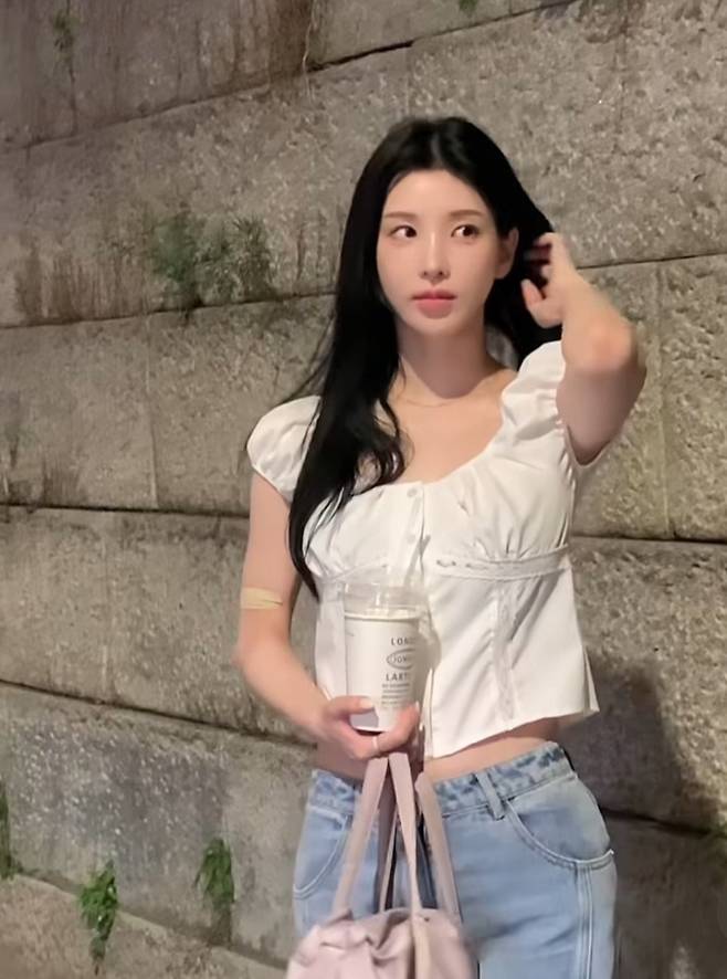 화이트 튜브 톱을 착용해 상체에 깔끔하면서도 여성스러운 실루엣을 강조했습니다.