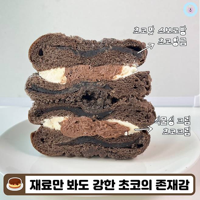 구성만 봐도 왜 초코맛이 진하다고 하는지 알 것 같은 느낌이었어요ㅋ.ㅋ 초코 앙금이 들어있는 초코맛 소보로빵 사이에 식물성 크림과 다크초코 크림이 샌드되어 있다는 점!