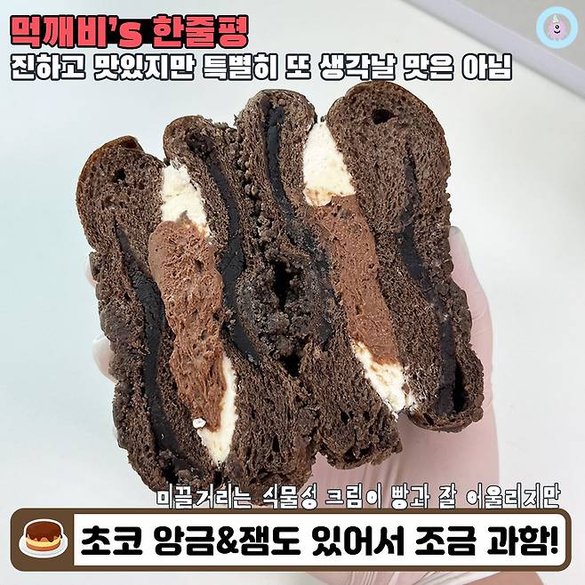 정말 당연한 얘기지만 빵부터 크림까지 전부 초코초코해서.. 당보충이 한 번에 빡- 되는 느낌이었어요. 아무 맛 안 나는 크림은 초코 맛을 더 진하게 해주는 역할을 하더라구요?!