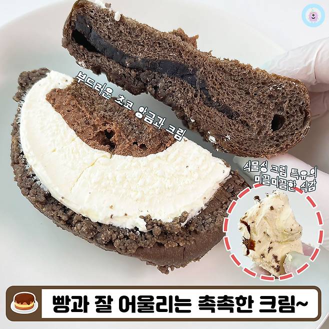구성만 봐도 왜 초코맛이 진하다고 하는지 알 것 같은 느낌이었어요ㅋ.ㅋ 초코 앙금이 들어있는 초코맛 소보로빵 사이에 식물성 크림과 다크초코 크림이 샌드되어 있다는 점!