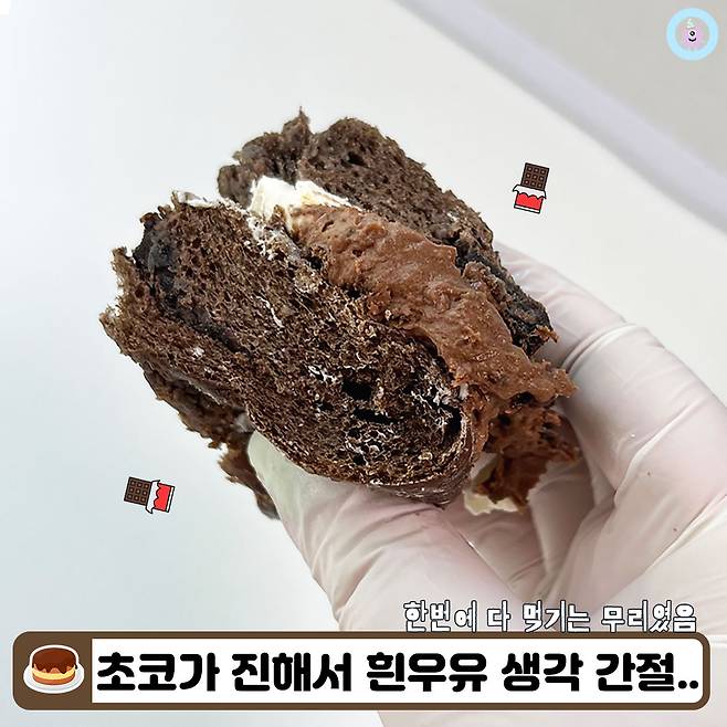 정말 당연한 얘기지만 빵부터 크림까지 전부 초코초코해서.. 당보충이 한 번에 빡- 되는 느낌이었어요. 아무 맛 안 나는 크림은 초코 맛을 더 진하게 해주는 역할을 하더라구요?!