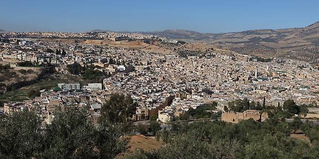 미로 도시 페즈가 한 눈에 내려다 보이는 언덕에서 촬영한 페즈 전경