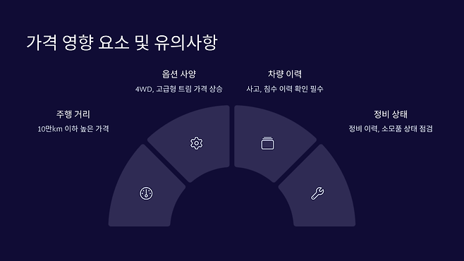 QM6 중고차 시세에서 중요한 요소 중 하나는 주행 거리와 차량 상태입니다. 주행 거리가 적고 차량 상태가 양호하다면 그만큼 시세가 높습니다. 예를 들어, 주행 거리가 10만km 이하인 차량은 상대적으로 높은 가격을 형성하며, 15만km 이상을 주행한 차량은 가격이 떨어질 수 있습니다. 또한, 사고 이력이나 정비 내역도 가격에 영향을 미칩니다.