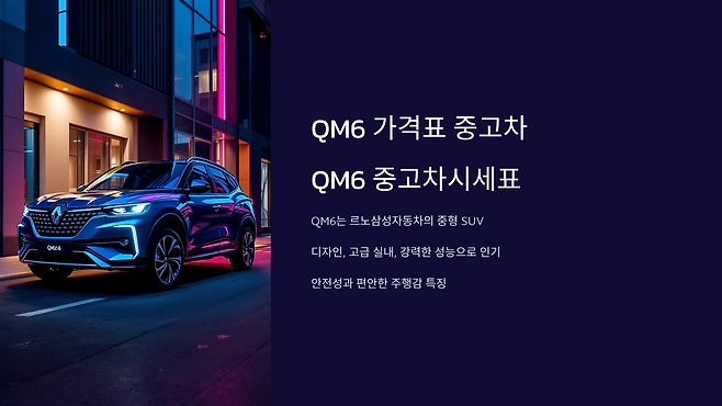 중고차 시장에서 차량의 가격은 여러 요소에 의해 결정됩니다. QM6 역시 마찬가지로 연식, 주행 거리, 차량 상태, 옵션 사양 등에 따라 가격이 달라지며, 이를 제대로 파악하는 것이 중고차 구매에 있어 매우 중요합니다. 또한, QM6는 고급 SUV로서 다른 차량들보다 상대적으로 높은 가격대가 형성되어 있습니다. 이런 이유로 정확한 중고차 가격을 아는 것은 구매자의 예산을 맞추는 데 매우 중요한 역할을 합니다.