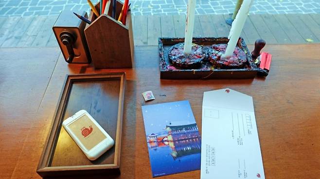 ‘느린 편지 세트’에는 엽서와 봉투, 우표는 물론, 엽서를 밀봉하는 실링 도구까지 포함돼 있어 방문객이 직접 우편 준비를 마칠 수 있도록 구성되어 있다.