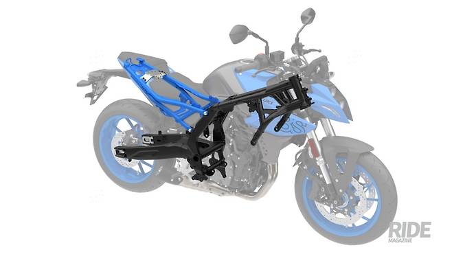 전체 섀시 레이아웃의 핵심 구조는 GSX-8S전용 설계된 매우 견고한 메인 프레임에서 시작된다. 노출된 시트 레일은 견고한 지지력을 제공하는 동시에 슬림한 사이즈와 절제된 외관으로 기능미를 더해준다. 마찬가지로 전용 설계된 경량 알루미늄 스윙암은 도로에서 이상적으로 움직이도록 최적화되었다. 프레임 형상은 직진 안정성과 민첩한 핸들링을 모두 제공할 수 있도록 세심하게 계획되었으며, 무게를 전면과 후면에 효과적으로 분산시키는 편안한 라이딩 포지션을 제공한다. 스즈키의 새로운 병렬 트윈 엔진의 컴팩트한 사이즈로 인해, 라이더는 코너를 통과할 때 체중을 전방으로 이동하고 차체를 보다 쉽게 제어할 수 있도록 힙 포인트를 조정함으로써 빠르게 대응할 수 있다.