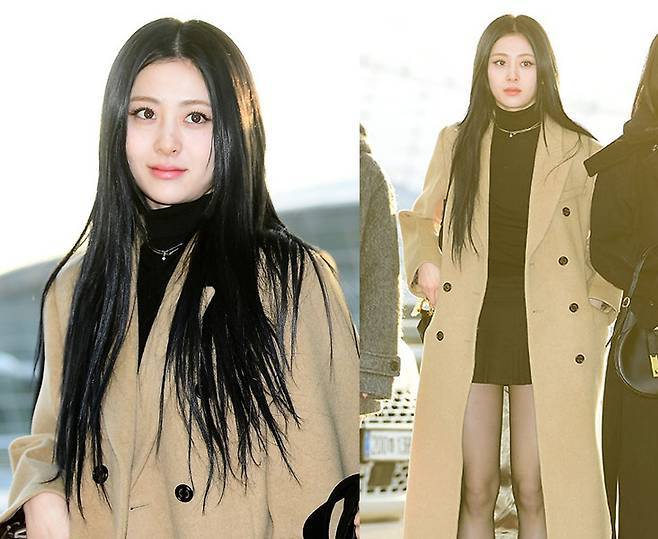 허윤진은 블랙 미니 원피스와 함께 베이지 롱코트를 매치해 우아하면서도 시크한 분위기를 연출했습니다.