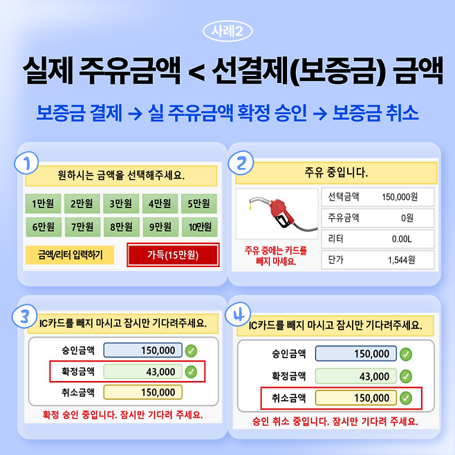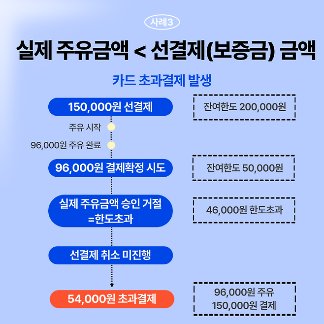 하지만, 주유한 금액이 선결제한 금액보다 적을 경우, 주유가 끝난 후 실제 주유 금액에 따라 승인 절차가 진행됩니다. 이때, 선결제했던 보증금은 원칙적으로 취소되어야 합니다. 그러나 실제 주유 금액의 결제가 카드 한도 초과 등의 이유로 승인 거절되면, 선 결제된 보증금이 취소되지 않아 실제 주유한 금액보다 많은 금액이 결제되는 초과 결제 문제가 발생할 수 있습니다.