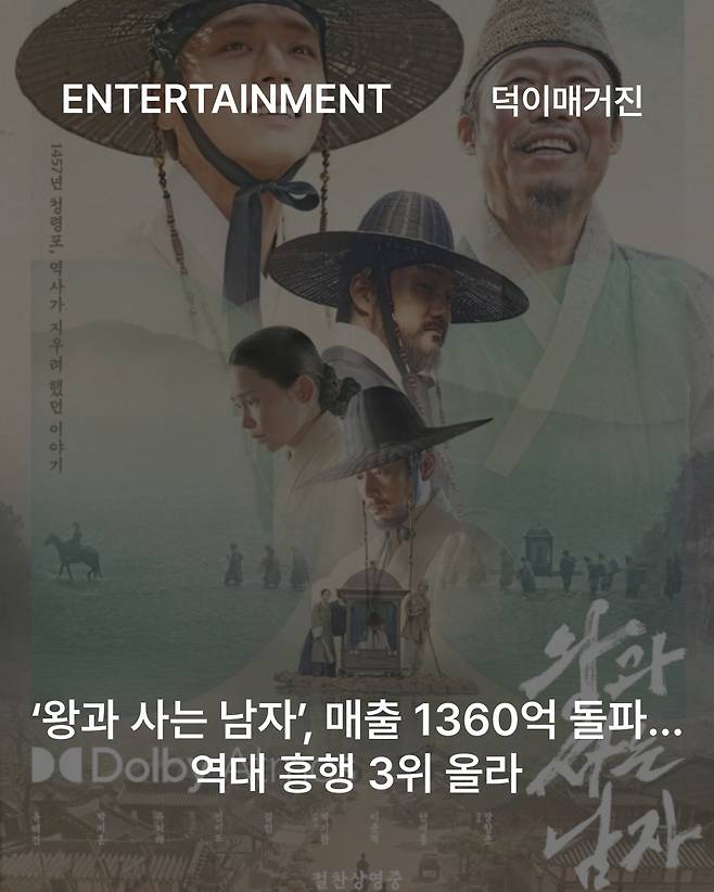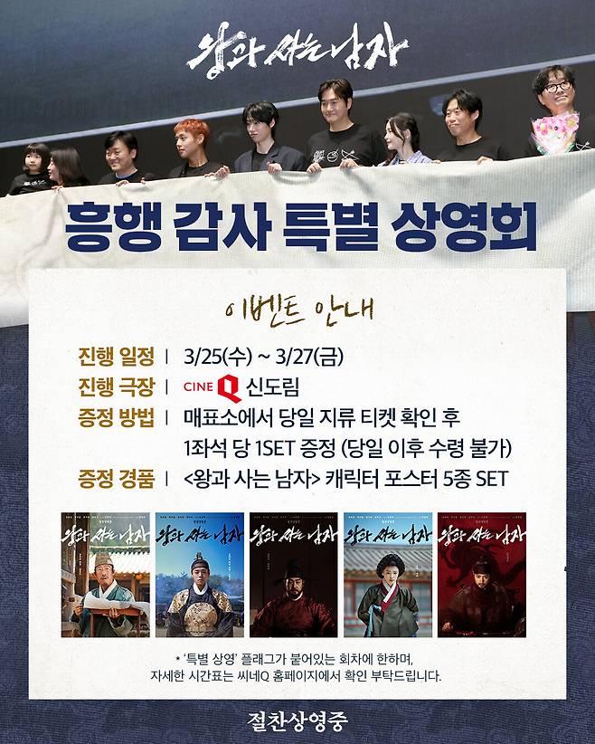 한편, 영화 ‘왕과 사는 남자’는 흥행 감사 특별 상영회를 진행합니다. 지난 20일 배급사 쇼박스 측은 “그대들의 뜨거운 관심에 진심으로 고맙소! ‘왕과 사는 남자’가 백성 여러분께 영원히 보답합니다”라는 글과 함께 흥행 감사 특별 상영회 이벤트를 안내했습니다. 안내에 따르면 이번 ‘왕과 사는 남자’ 흥행 감사 특별 상영회는 오는 25일부터 27일까지 씨네Q 신도림 지점에서 진행됩니다. 매표소에서 당일 티켓 확인 후 한 좌석당 ‘왕과 사는 남자’ 캐릭터 포스터 5종 한 세트를 증정합니다.
