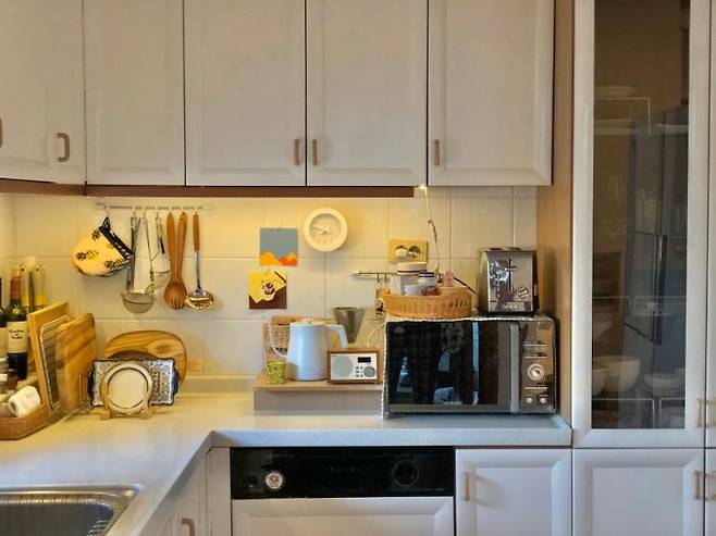 싱크대 상판을 최대한 깔끔하게 유지하고 싶어서 전자레인지도 보이지 않는 곳으로 옮기고 싶지만