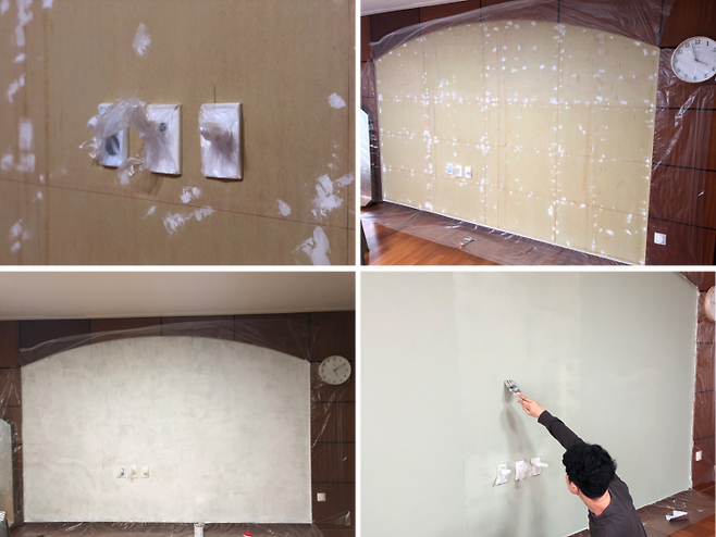 처음은 기포가 생겨 몇 번을 붙였다 뗐다를 반복했지만, 벽 한 면을 마치니 요령이 생기더라고요.
