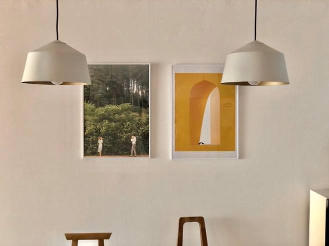 이 공간의 포인트는 네 가지가 있는데요 테이블, 조명, 액자, 선반이에요.