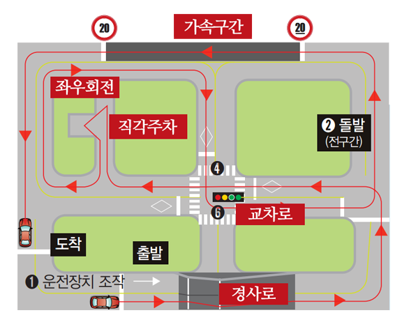 현재까지 운영되고 있는 세 번째 코스는 7개 평가항목으로 구성돼 있습니다. 경사로, 회전, 신호 교차로, 직각 주차, 가속 코스 등이 추가됐죠. 직각 주차는 첫 번째 코스의 난코스로 불렸던 티(T)자 코스와 같은 항목입니다. 면허 합격률도 평균 80% 수준으로 떨어졌죠.