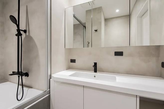 욕실은 집주인이 출장 중 자주 머무는 미국 호텔의 이미지를 본떠 디자인되었습니다. 벽면은 입자가 살아 있는 거친 질감의 그레이톤 마감제로 마감하고, 블랙 메탈 소재의 수전으로 포인트를 주었습니다.