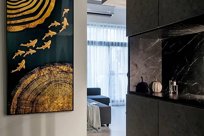 입구에 걸린 '구어도'는 상업을 하는 집주인의 요청에 따라 설치된 것으로, 재물을 끌어들이는 풍수적 의미를 지닙니다. 벽면은 돌결이 드러난 마감으로 전체 인테리어의 무드인 그레이와 블랙 톤을 예고하며, 입구부터 강렬한 인상을 줍니다.