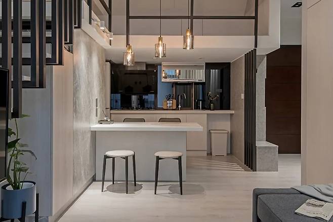 주방은 회색 거울 마감과 숨겨진 가전 수납장이 조화를 이루며 미니멀하지만 기능적인 형태로 완성되었습니다. 바 형식의 다이닝 공간에는 금속 프레임과 유리 소재 조명을 배치해 도시적 감성을 강조했습니다.