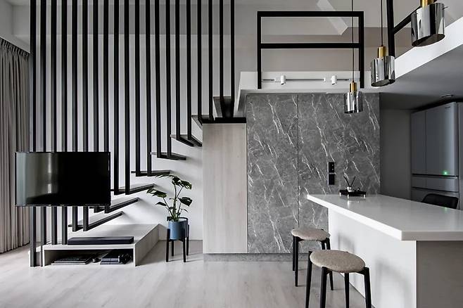 현관의 철제 그라데이션은 자연스럽게 거실로 이어집니다. 오래된 계단 손잡이를 철거하고, 블랙 철제로 구성된 일체형 구조물을 설치하여 계단, TV 벽, 장식 요소의 기능을 모두 수행합니다.
