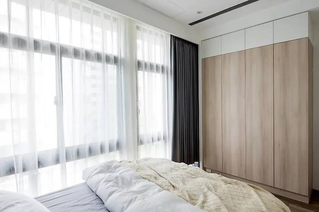 침대 측면에는 붙박이장이 아닌 벽면 전체를 따라 낮은 수납장을 배치하여 개방감을 유지했습니다.