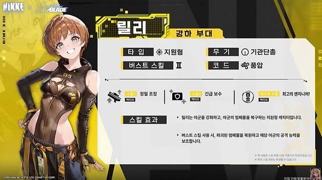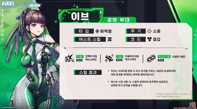 이브는 3버스트 화력형, 철갑 코드의 AR 니케다. 아직 스킬 효과에 대한 상세한 정보는 공개되지 않았지만, 현재까지 확인된 내용을 봤을 때 3버스트 화력형 딜러답게 파티의 메인 딜러로 활약할 것으로 예상된다.