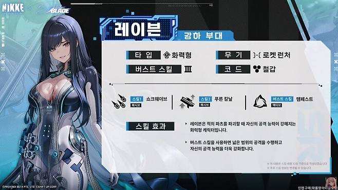 레이븐도 이브와 마찬가지로 3버스트 화력형, 철갑 코드의 니케다. 화기는 RL이다.