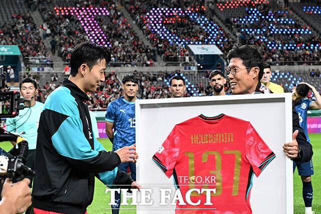 [더팩트ㅣ서울월드컵경기장=남용희 기자] 한국 남자 선수 A매치 최다 출전 달성에 성공한 손흥민(왼쪽)이 14일 오후 서울 마포구 서울월드컵경기장에서 열린 'Legend Old & New – From Cha, To. Son' 특별 행사에서 차범근 전 감독에게 기념 유니폼을 전달받은 뒤 기념촬영을 하고 있다.