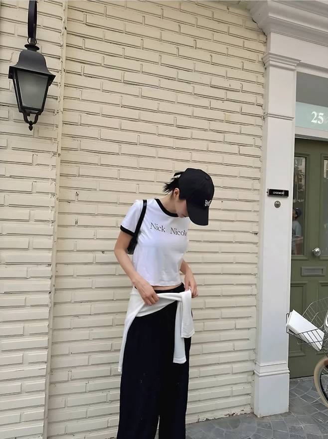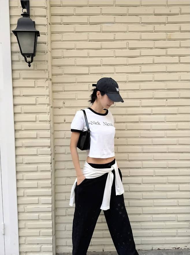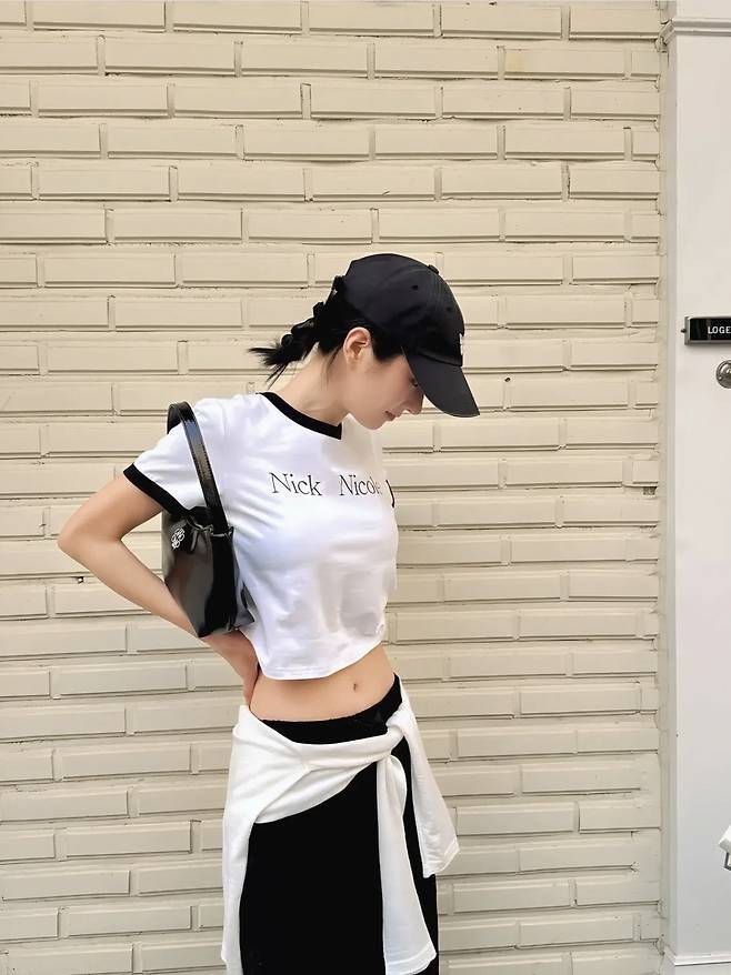 여기에 블랙 미니 숄더백과 야구 모자, 그리고 낮은 포니테일 헤어스타일로 쿨한 무드를 더하며 꾸안꾸 매력을 뽐냈습니다.