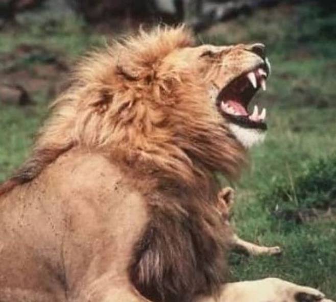 갑작스러운 상황에 너무 놀란 아빠 사자는 고통 속에서 포효했는데요. 오만 인상을 쓰고 있는 아빠 사자.
