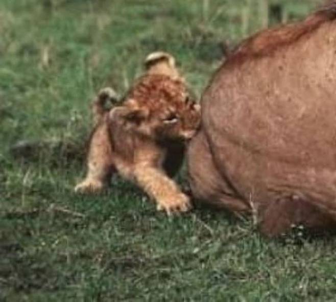 겁도 없이 자기 자신보다 덩치가 몇 배나 훨씬 큰 아빠 사자의 엉덩이를 깨문 아기 사자가 있습니다.