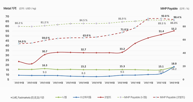 외부 환경도 우호적으로 돌아섰다. 장기간 실적을 압박했던 메탈 가격이 반등하면서 마진 개선의 여건이 마련됐다. 런던금속거래소(LME)와 글로벌 원자재 시황 분석기관 패스트마켓에 따르면 올 1월 말 기준 리튬 가격은 직전 분기 말보다 약 98% 급등했다. 니켈 가격 역시 16% 상승했다. 핵심 배터리 소재 가격이 함께 반등하면서 제품 판매단가와 원가 간 스프레드가 빠르게 확대되고 있다.