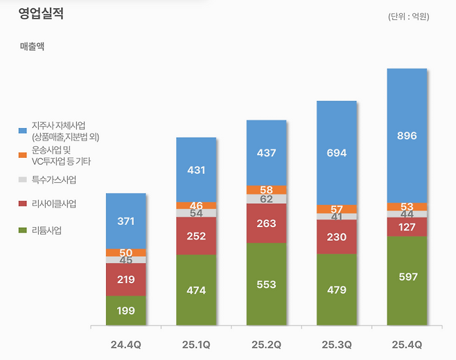 눈에 띄는 변화는 지주사 자체사업의 계단식 성장이다. 메탈트레이딩과 투자수익 등을 포함한 지주사 단독사업 매출은 △1분기 431억원 △2분기 437억원 △3분기 694억원 △4분기 896억원 등으로 분기마다 최고치를 경신했다.