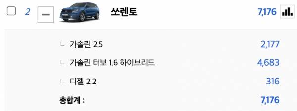 쏘렌토는 디젤을 포함한 3가지 파워트레인을 준비했지만 대부분 판매량은 하이브리드에 집중됐다. 하이브리드 트림은 기존 모델부터 이어지던 심각한 출고 적체가 해소되지 않아 여전히 11개월 대기가 필요하다.