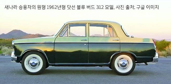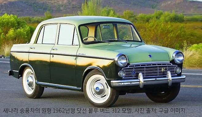 닷선 블루버드는 1959~1962년식의 전기형 310과 1962년~1963년식의 후기형 312 모델이 있으며, 이들 중 후기형 312 모델이 새나라 승용차로 우리나라에 나온 모델로 보입니다.