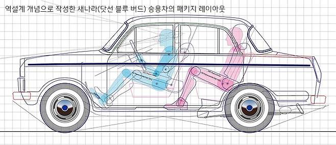 이렇게 휴먼 스케일로 실내를 분석하면 새나라(블루버드)가 동양인 95백분위 신체 크기에는 맞는 실내 공간이지만, 앞 뒤를 모두 서구인 95백분위 신체 크기 기준으로 하면 뒷좌석에는 서구인이 앞좌석과 동시에 앉을 수는 없을 정도로 좁은 공간임을 볼 수 있습니다.