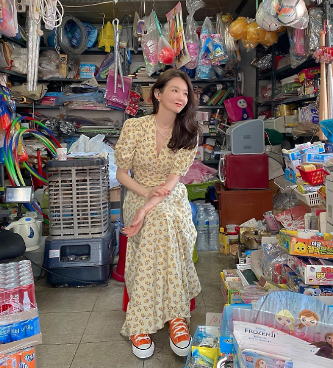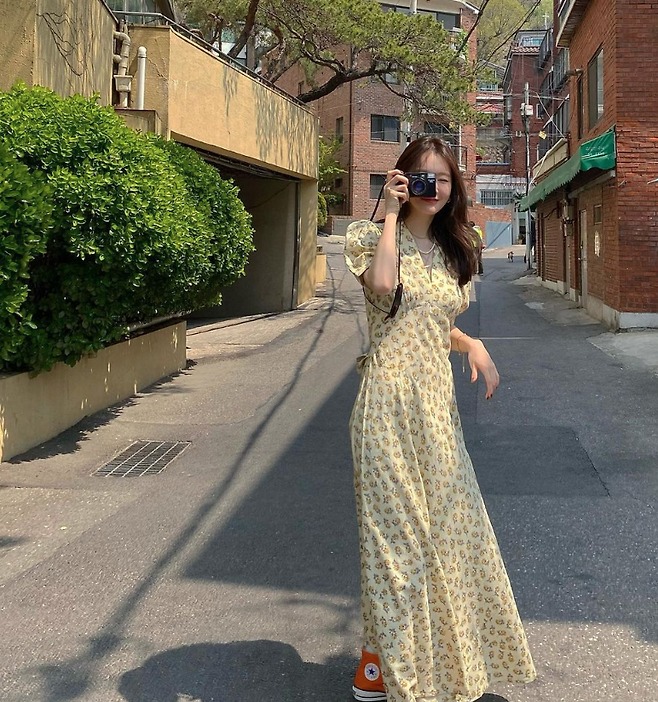 강민경은 기장감이 긴 원피스에 주황색 스니커즈를 매치해 캐주얼한 느낌도 더했습니다.