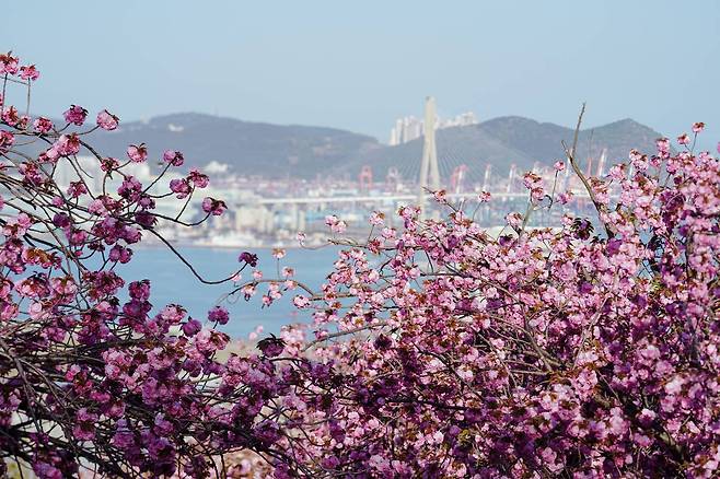 마지막으로 소개해 드릴 곳은 부산의 민주공원입니다. 산복도로를 따라 올라가면 만날 수 있는 이곳은 겹벚꽃 터널 사이로 부산항과 푸른 바다가 한눈에 들어오는 반전 뷰를 자랑하죠. 분홍색 꽃송이 너머로 펼쳐지는 파란 바다의 대비는 사진작가들이 가장 사랑하는 구도 중 하나이기도 합니다.