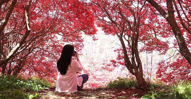 전주 완산칠봉 투구봉 근처에 조성된 꽃동산은 4월 말이면 겹벚꽃과 철쭉이 동시에 만개하여 그야말로 꽃의 바다를 이룹니다. 이곳은 단순히 꽃이 있는 수준을 넘어 산 전체가 진한 분홍색과 붉은색으로 타오르는 듯한 장관을 연출합니다.