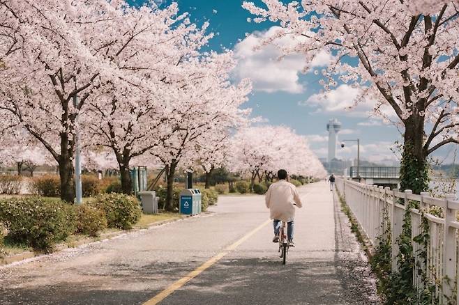 수도권에서 멀리 가지 않고도 겹벚꽃을 즐길 수 있는 최고의 장소는 하남 미사경정공원입니다. 시원한 조정 카누 경기장을 따라 길게 이어진 길은 남녀노소 누구나 사랑하는 포인트죠.