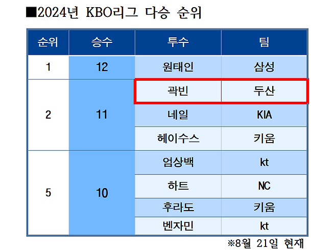 하지만 원태인이 20일 포항구장에서 열린 두산전에서 승리투수가 되면서 먼저 시즌 12승 고지를 밟으며 단독 1위로 치고 나갔다. 이제 1승 차이로 곽빈, 헤이수스, 제임스 네일(KIA)이 공동 2위 그룹을 형성해 추격전을 펼쳐야 하는 상황이다.