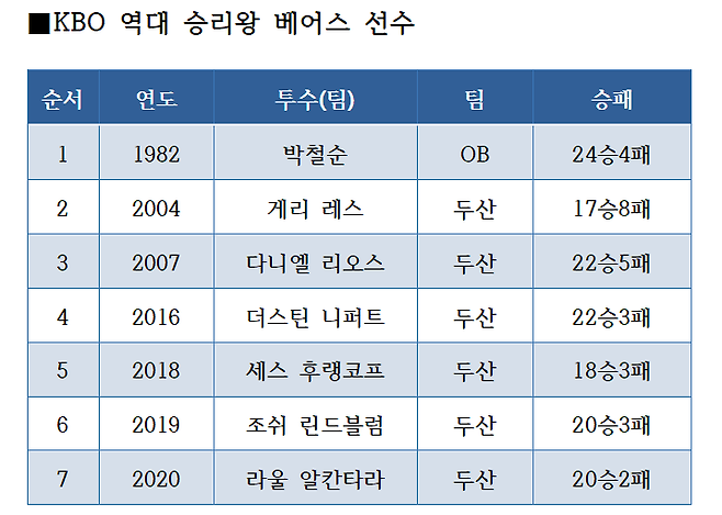 베어스는 앞서 살펴본 대로 2023년까지 총 7명의 다승왕을 배출했다. 그러나 두산 시대 이후 다승왕 6명은 모두 외국인 투수였다. 한국인 투수가 다승왕에 오른 것은 아직까지 박철순이 유일하다.