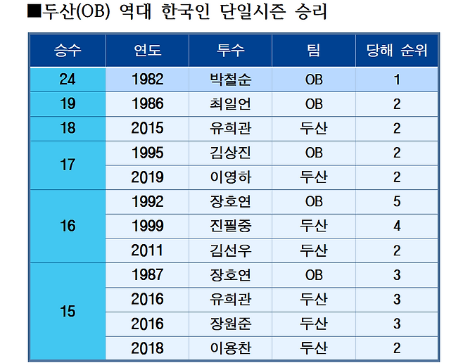 1982년 박철순 이후 OB 베어스에서 더 이상 다승왕은 나오지 않았다. 다시 말해 OB 베어스 시절 다승왕은 박철순이 유일하다.