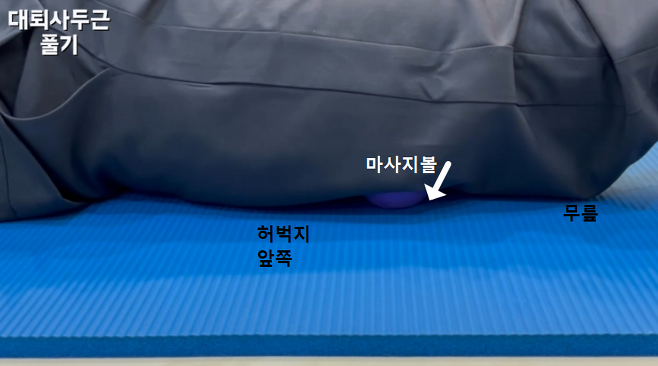 1. 먼저 허벅지 앞쪽에 마사지볼을 두고 다리를 좌우로 움직이며 무릎 위쪽을 풀어줍니다.