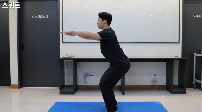 스쿼트 자세로 살짝만 내려간 상태에서 10초를 버텨줍니다. 오히려 무릎 통증이 있는 분들은 왔다갔다 하면 통증이 더 심해지기 때문에 버티기만 하는 게 좋아요. 이때 무릎이 모아지거나 벌어지면 안 되고 그대로 일자로 내려갑니다. 스쿼트할 때 무릎이 발 앞으로 나가도 괜찮아요. 오히려 억지로 무릎이 나가지 않도록 빼다 보면 더 다칠 수도 있습니다.
