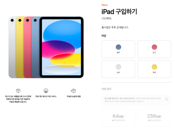 신형 아이패드 10세대 모델은 64GB, 256GB 두 가지 용량에 블루, 핑크, 옐로, 실버 마감으로 출시되며, 국내 판매 가격은 Wi-Fi 모델이 67만9천원부터, 셀룰러 모델은 91만9천원부터다.
