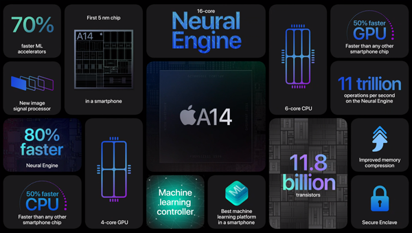 애플은 A14 Bionic 칩이 탑재된 아이패드가 경쟁 플랫폼인 안드로이드 태블릿 PC 대비 최대 5배 빠른 속도를 자랑하며, 아이패드(7세대)와 간은 기존 모델에서 업그레이드 하려는 사용자는 전반적으로 최대 3배 향상된 성능을 경험할 수 있다. A13 대비 2배 향상된 16코어 뉴럴 엔진으로 머신러닝 역량을 최대 80% 향상시킨다.