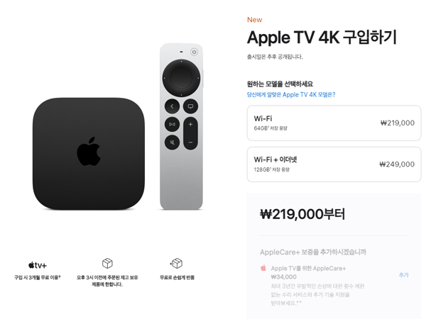 국내 출시 가격은 애플 TV 4K (Wi-Fi) 64GB 모델이 21만9천원, 애플 TV 4K (Wi-Fi + 이더넷) 128GB 모델은 24만9천원이다.