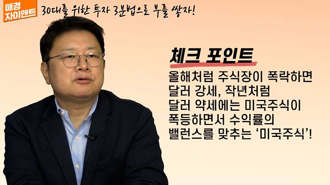 홍 대표는 "투자 3분법의 장점은 전체 자산의 3분의 2는 달러자산으로 불황 때 달러가치 상승으로 안전망 역할을 하고, 동시에 전체 자산의 3분의 2를 주식에 배분해 호황 때는 주가 상승에 편승할 수 있다"고 덧붙였다.