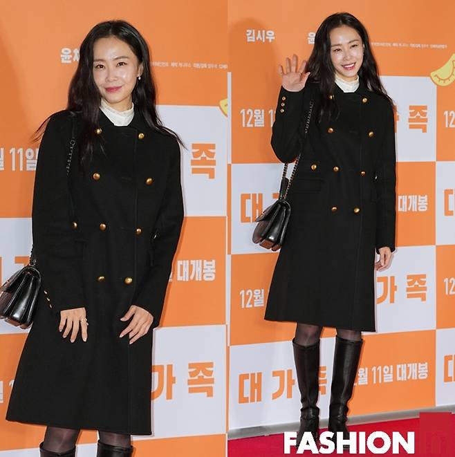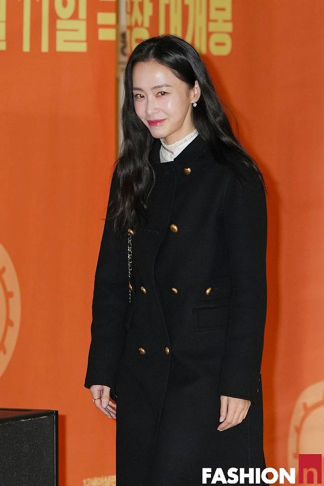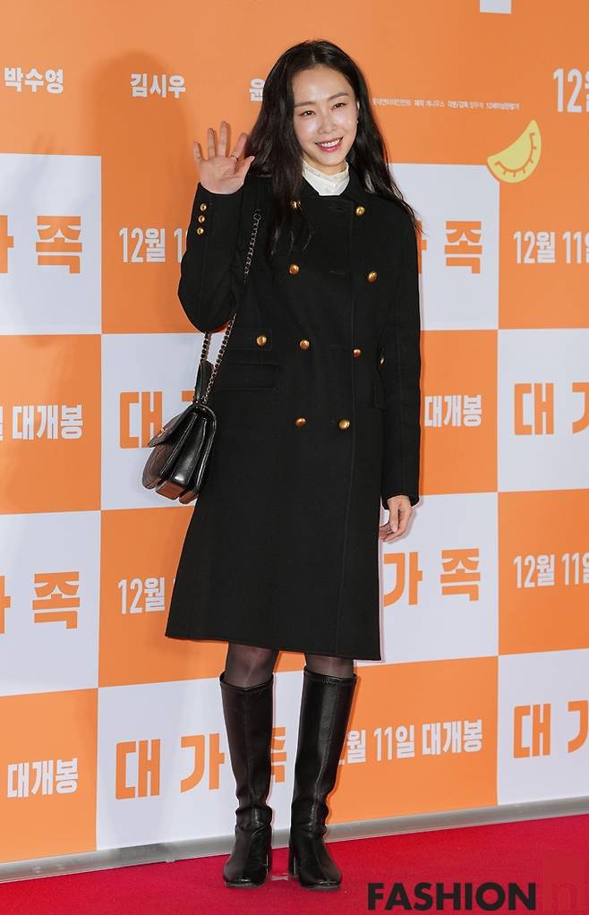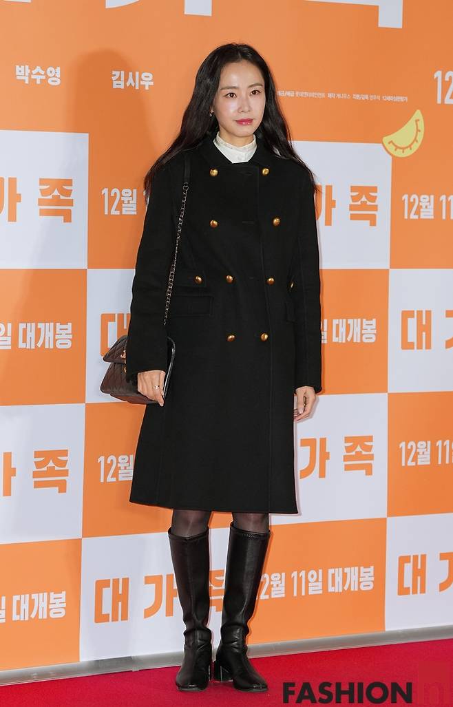 이날 홍수현은 가녀린 몸매에 클래식한 금빛 더블 골드 버튼이 멋스러운 블랙 롱 코트로 세련되면서도 품격있는 드뮤어룩으로 시사회 나들이를 즐겼다.